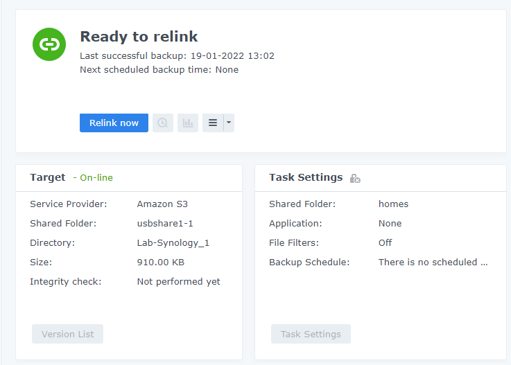 - Send the storage device to us. Once we have given confirmation the data has been copied into our S3 storage platform, go to the backup job in Hyper Backup and select the Relink now button.